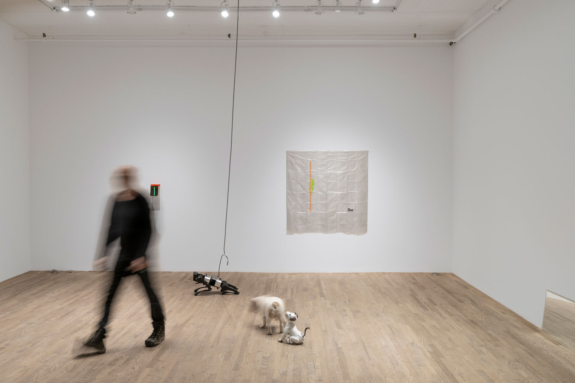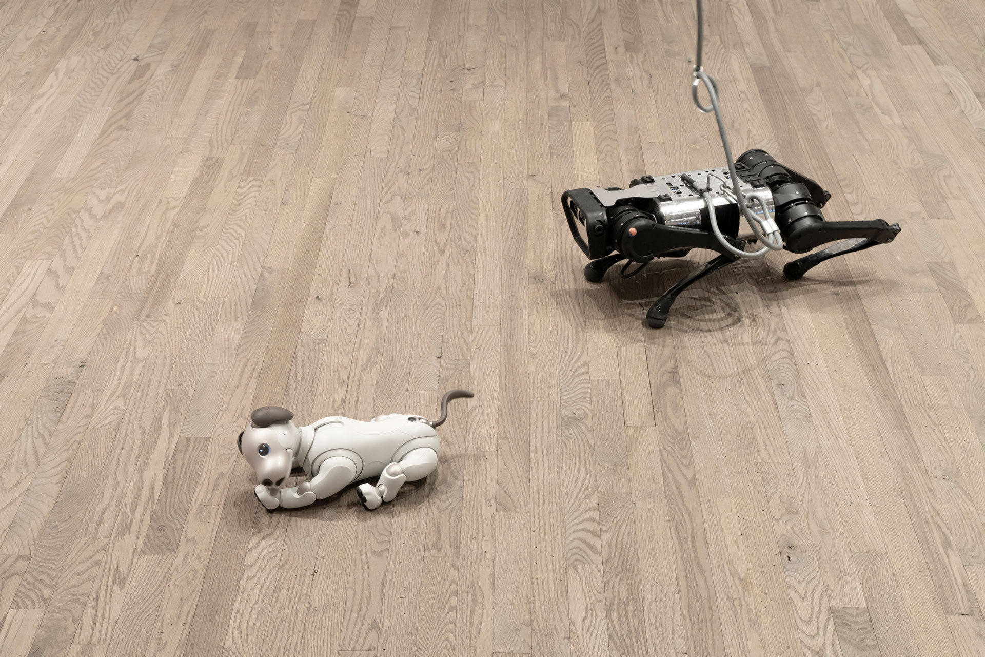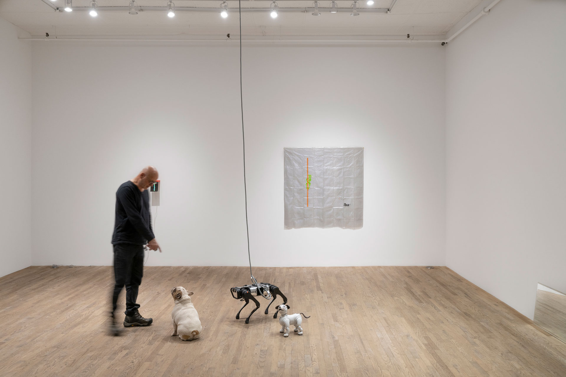 BFF stages a dog park among biological dogs, robots, and humans. The unique interaction between the viewers and the dogs revisits the human expectations of a pet and the true meaning of companionship. The artist brings three dogs together, the furry French Bulldog, the white toy dog, and the black robot dog. Toy dog interacts with people like an ordinary lovable puppy, whereas robot dog takes heavy dog steps on the wooden floor like a soldier, and Bulldog running between those two, full of wonder. The work presents interesting and intense gathering dynamics, leaving participants with endless curiosity and deep reflection.