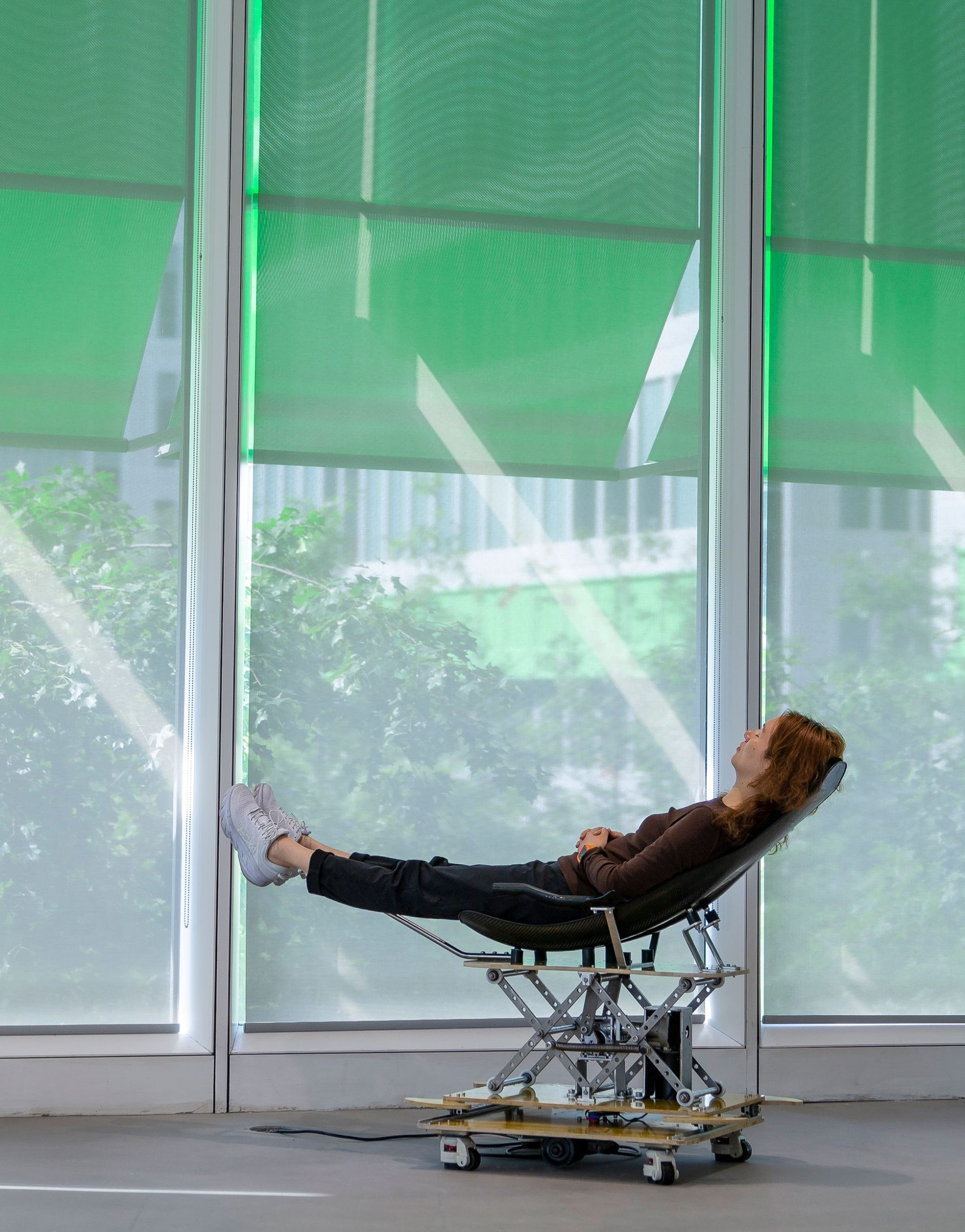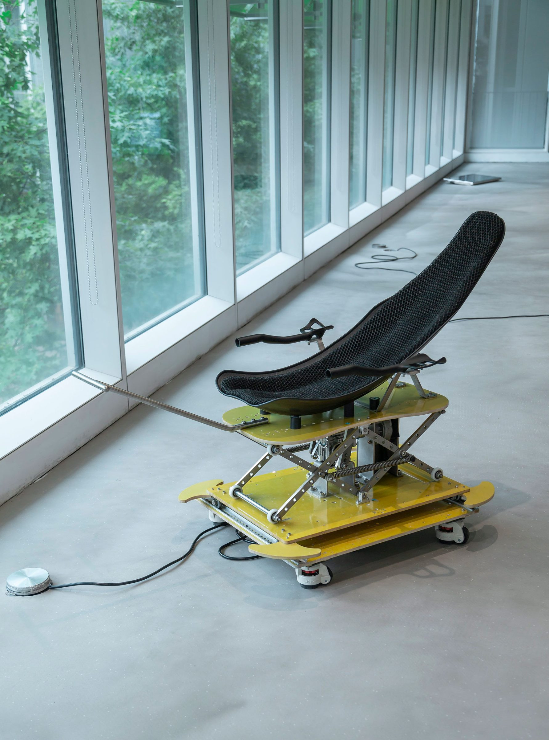 Cradle is a beautiful silver steel structure engineered to reproduce a gentle motion for an adult to lie down and be soothed to sleep like a baby. In place of a human’s manual handling, the work’s machinery arms and legs support the user’s weight and enact a rocking movement. Bearing the weight of an average adult, Cradle demonstrates an act of comfort powered by industrial forces and technological prowess. By bringing a private moment into the public sphere, the work provides a cradling experience that transforms paternal caretaking into a universal act of care, unbounded by age.