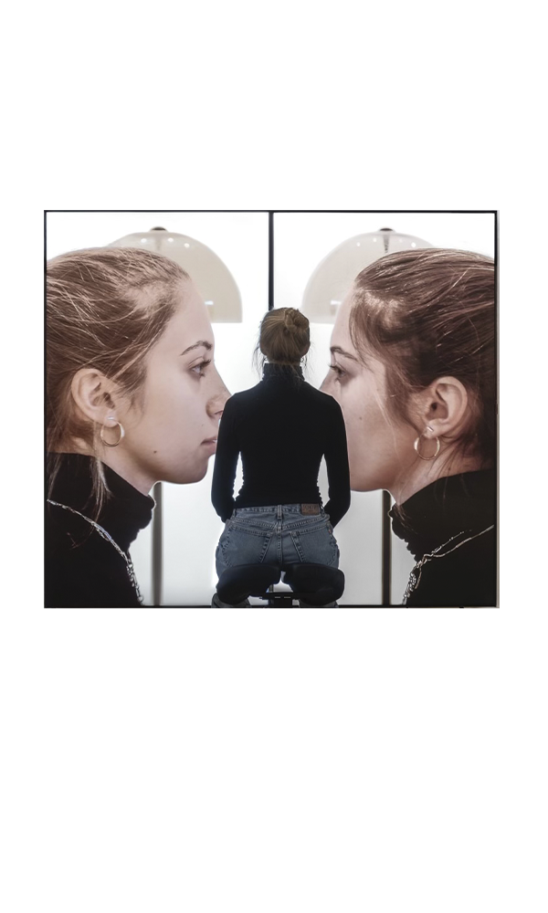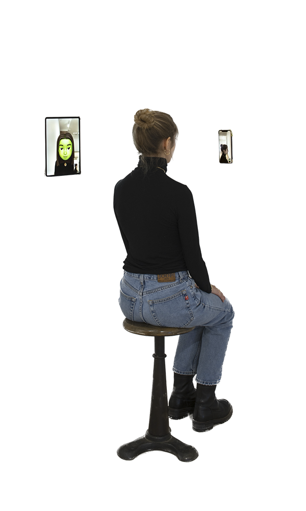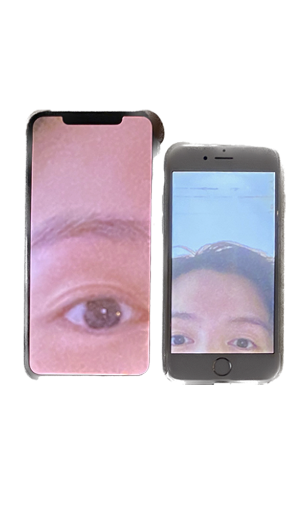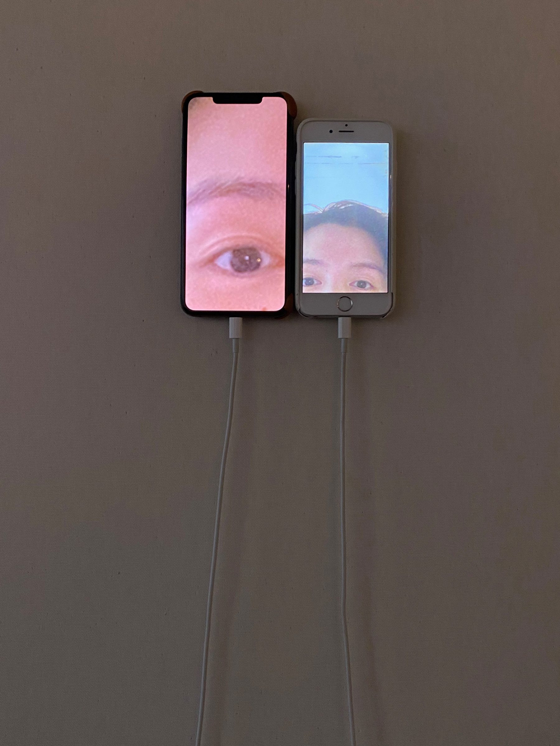 Mirror 3 stages the viewer's self-image as a diptych through the juxtaposition of used phones. The installation consists of two wall-mounted iPhones that magnify the viewer's face. The extreme magnification results in a fragmented and distorted view of one’s face, generating an unrecognizable view of oneself. Mirror 3 abstracts a person in the mirror, allowing the viewer to view themselves again with curiosity.
