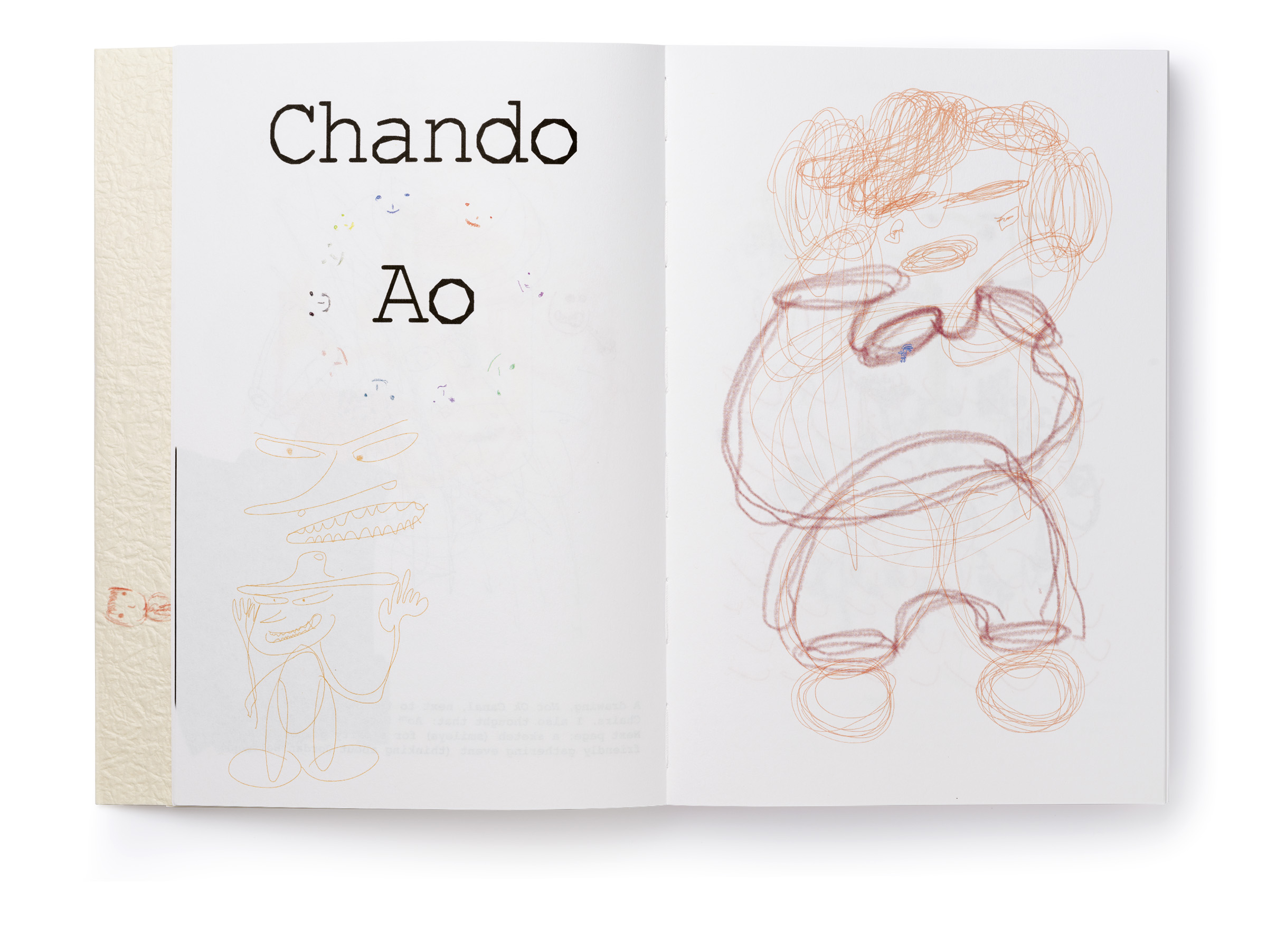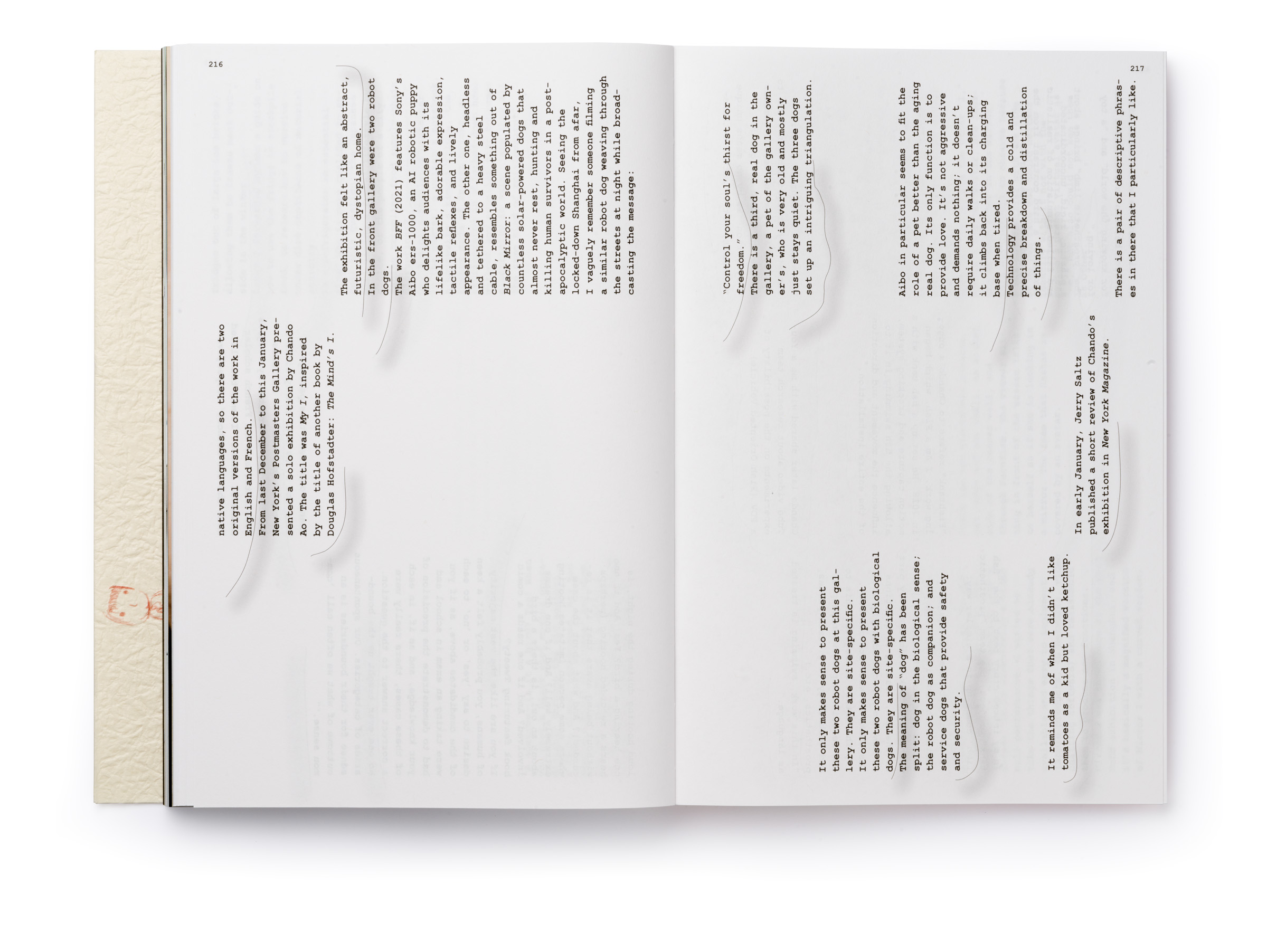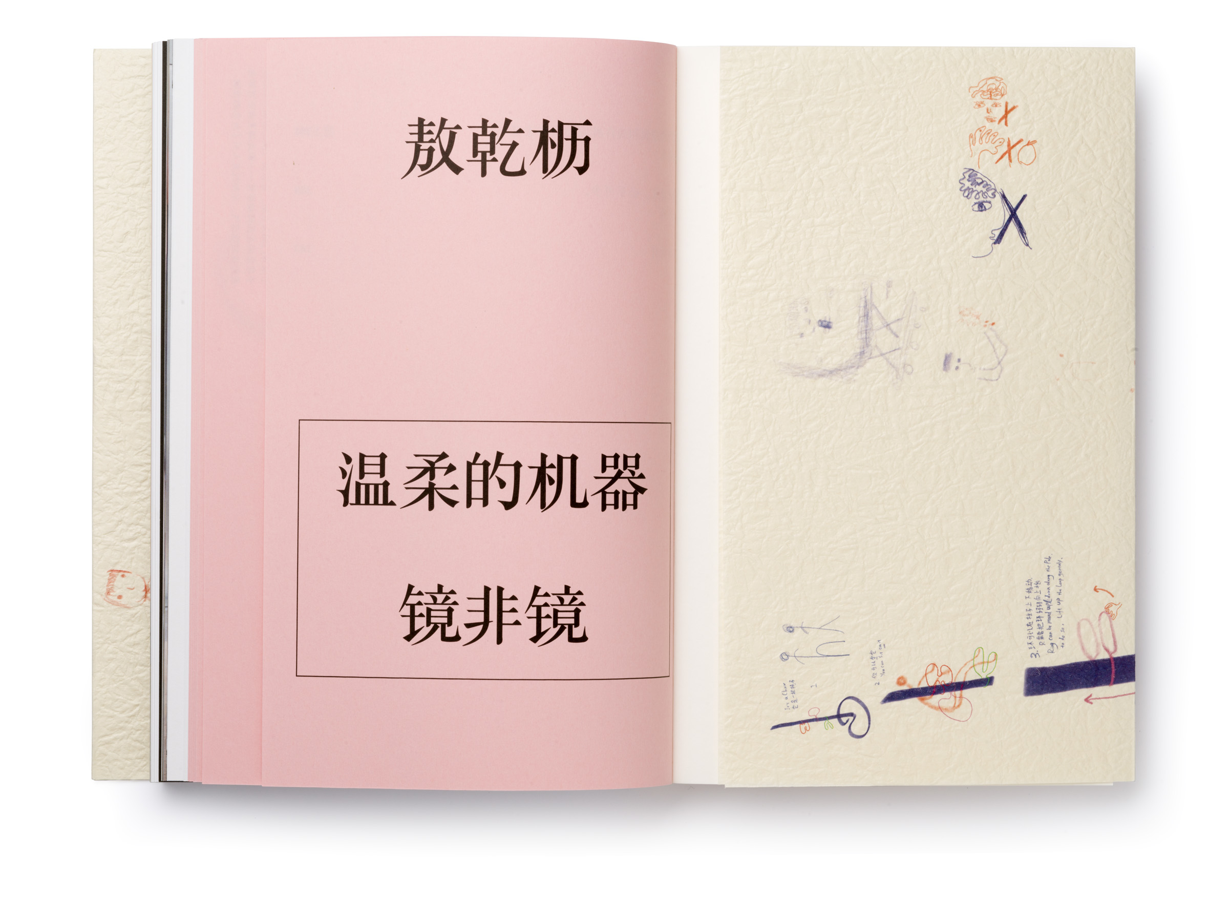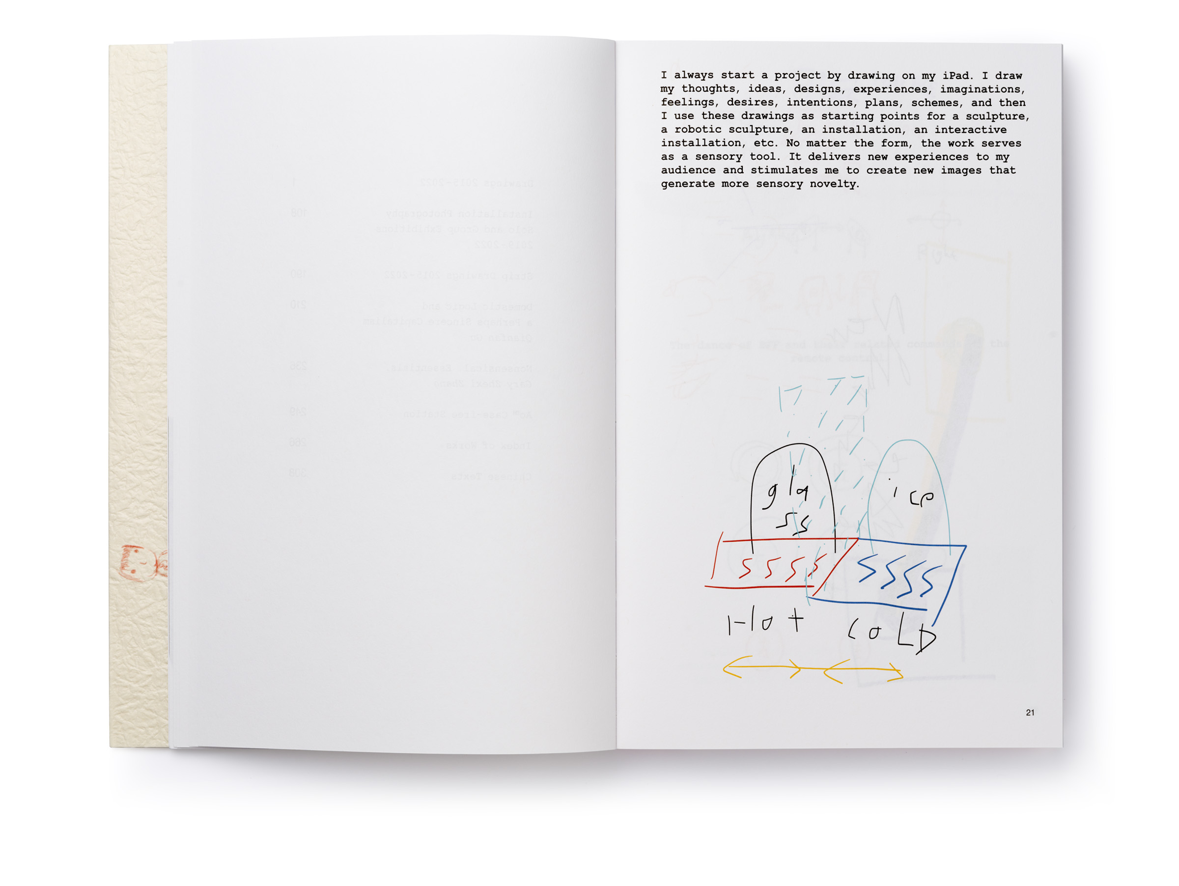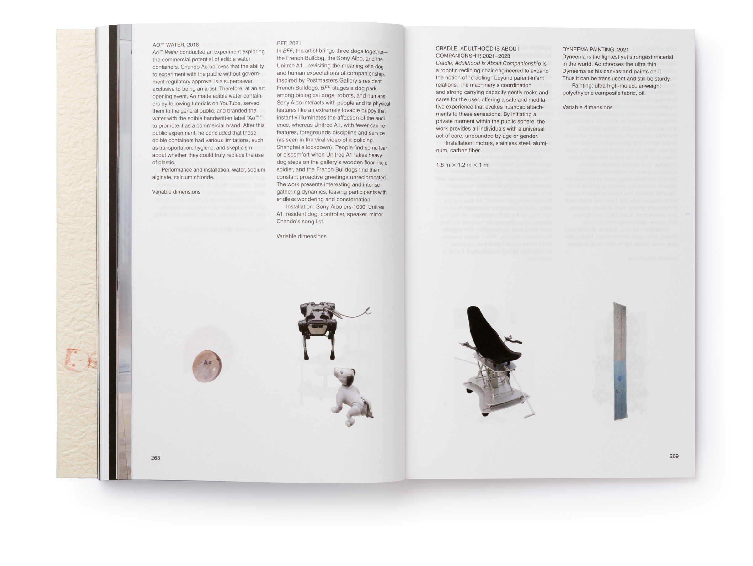 Warm Machine and Other Mirrorless Reflections is Chando Ao’s first monograph published and distributed internationally. The book is a proper representation of his mental state that he describes as a navigation between two extremes: “on the one hand, (he focuses on) his solo endeavors in paintings and drawings. On the other hand, he builds a complex and open system, which needs to be accomplished in conjunction with the external world, which includes robots, flora and fauna, software, food, machinery, exceptionally unique materials, and everyday consumer goods.” There is a dissonance between some of the (big) tech he wishes to use in his work and the concept sketches he makes that put these technologies up to use (in very playful ways). The book delves deeper through an interview featuring interwoven voices, including Gu Qianfan, Chando Ao, and Yve Yang (when reading it we wonder who’s who). Gary Zhexi Zhang was also invited to finally complement the book with a contribution in the form of an essay that attempts to clarify some of his understandings of the artist’s work and what it all means in present times. The book was printed in China using offset printing technology. It presents many of Chando’s iPad illustrations (single illustrations and stripes) and also photographs of his art installations in full color. The cover sleeve was printed on Japanese stock. The book binding is a lay-flat sewn and glued soft cover.