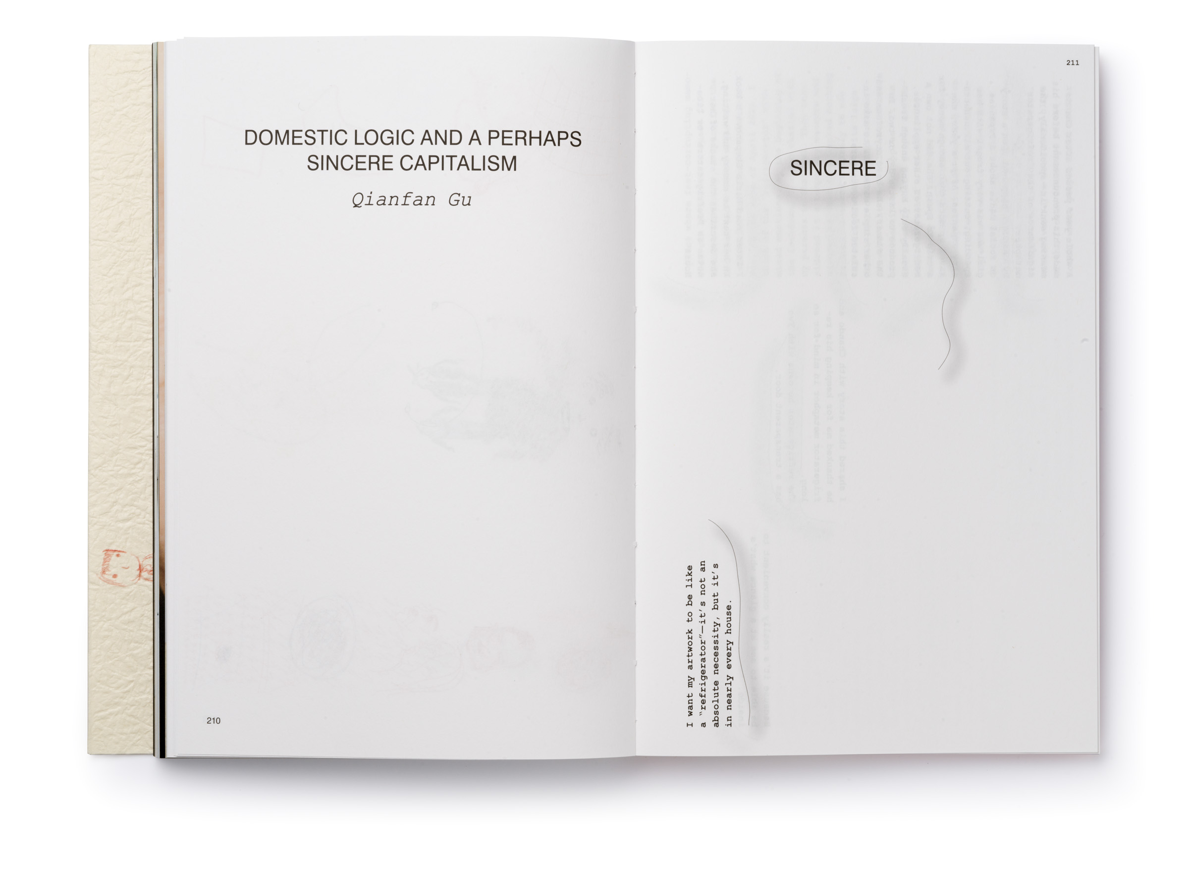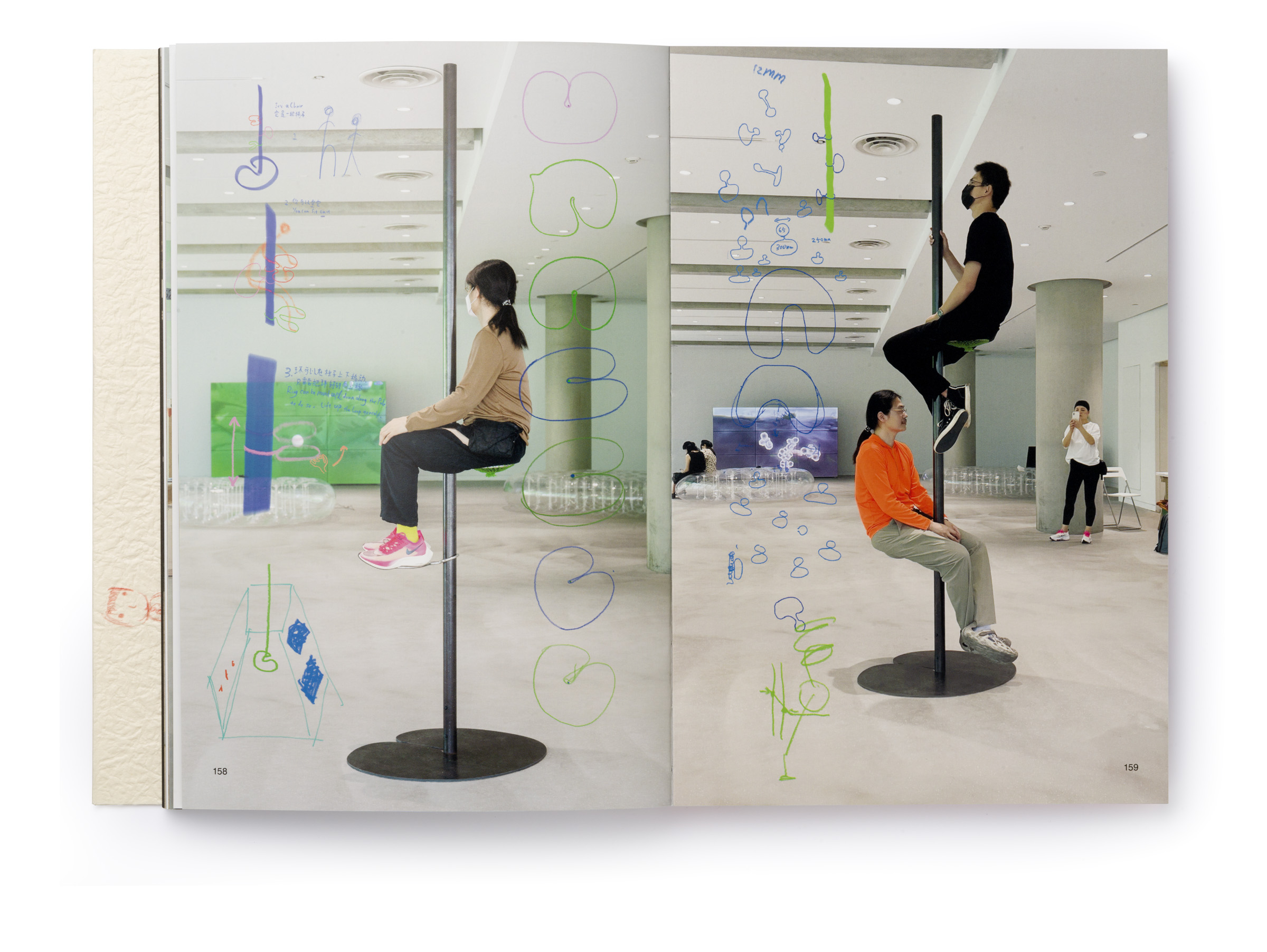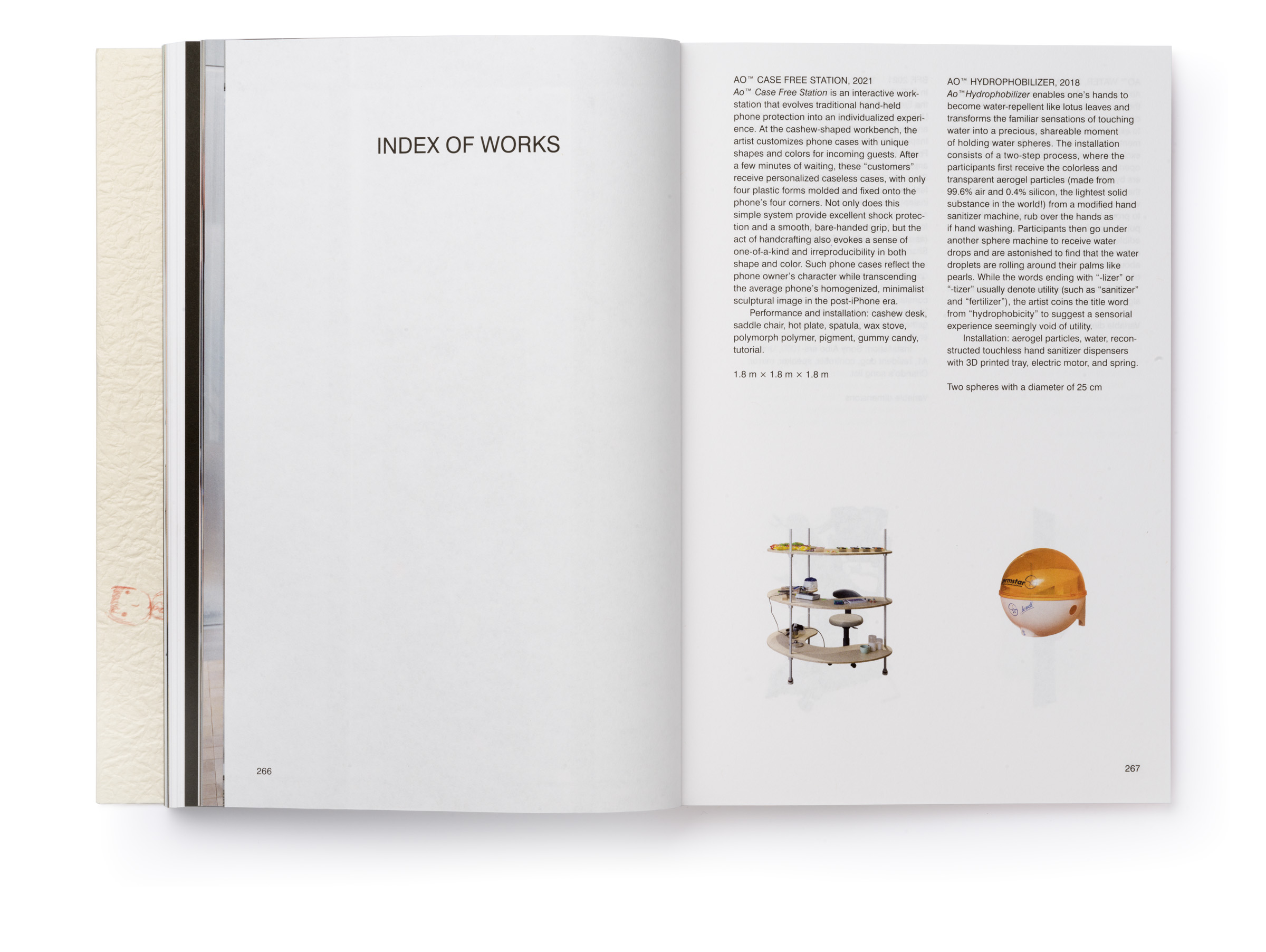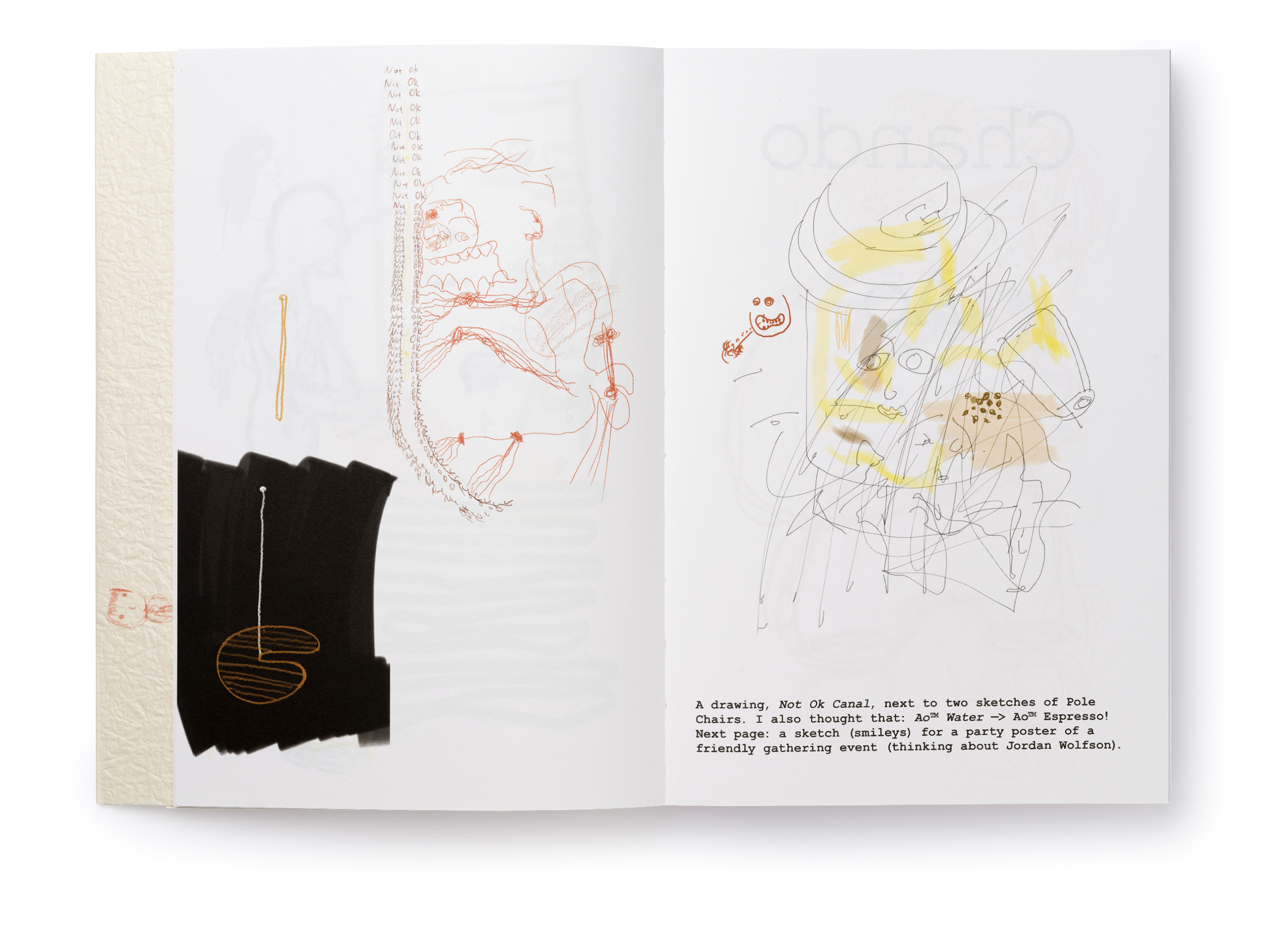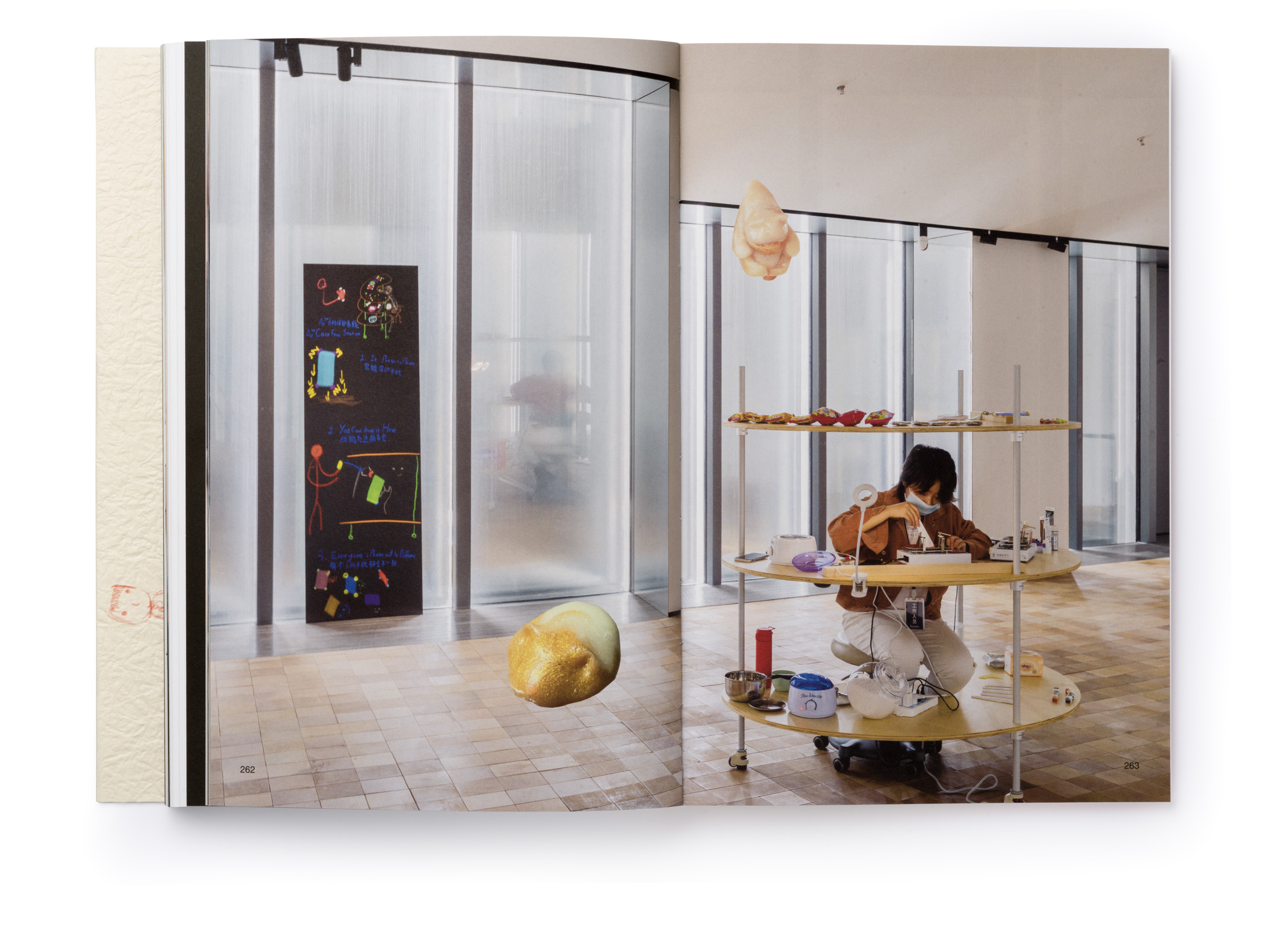 Warm Machine and Other Mirrorless Reflections is Chando Ao’s first monograph published and distributed internationally. The book is a proper representation of his mental state that he describes as a navigation between two extremes: “on the one hand, (he focuses on) his solo endeavors in paintings and drawings. On the other hand, he builds a complex and open system, which needs to be accomplished in conjunction with the external world, which includes robots, flora and fauna, software, food, machinery, exceptionally unique materials, and everyday consumer goods.” There is a dissonance between some of the (big) tech he wishes to use in his work and the concept sketches he makes that put these technologies up to use (in very playful ways). The book delves deeper through an interview featuring interwoven voices, including Gu Qianfan, Chando Ao, and Yve Yang (when reading it we wonder who’s who). Gary Zhexi Zhang was also invited to finally complement the book with a contribution in the form of an essay that attempts to clarify some of his understandings of the artist’s work and what it all means in present times. The book was printed in China using offset printing technology. It presents many of Chando’s iPad illustrations (single illustrations and stripes) and also photographs of his art installations in full color. The cover sleeve was printed on Japanese stock. The book binding is a lay-flat sewn and glued soft cover.